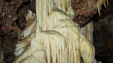 Se forman cuando el agua rica en minerales fluye de manera continua por paredes o suelos, creando superficies lisas y solidificadas. Pueden cubrir grandes zonas de la cueva y dan la sensación de que la roca ha “fluido”, moldeando el paisaje subterráneo.