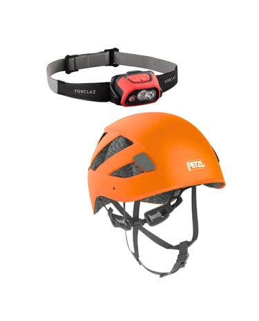 El casco protege frente a golpes, caídas de pequeñas rocas o impactos con el techo y las paredes de la cueva. Además, se le coloca un frontal, que proporciona la iluminación necesaria para avanzar con seguridad por el interior de la cavidad y observar el entorno subterráneo durante toda la actividad.