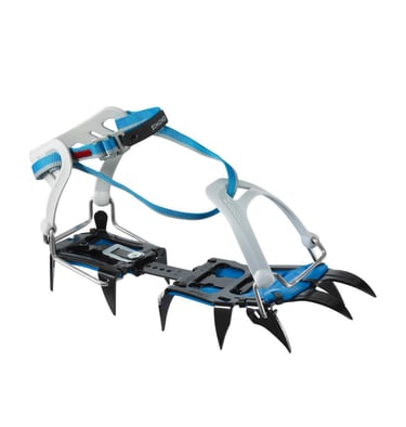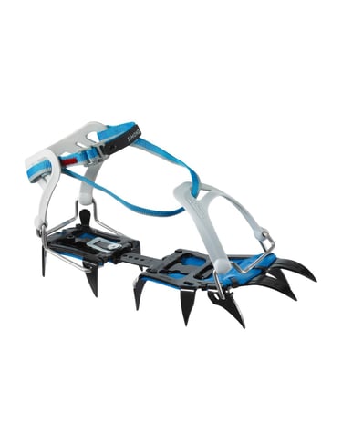 Son dispositivos metálicos con puntas que se fijan a las botas de montaña para proporcionar tracción sobre nieve dura o hielo. Son fundamentales en rutas invernales y permiten avanzar con mayor estabilidad y seguridad en terrenos resbaladizos o inclinados.